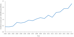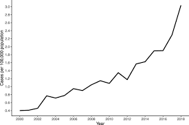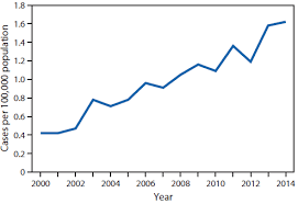 The median number of cases per year was 360. There was no temporal trend in the number of cases per 100000 US residents reported per year P 3. R 2 006.